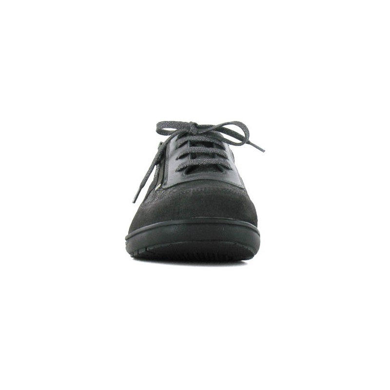 Solidus nous propose une gamme de chaussures hautement évoluée dans le domaine confort/pieds sensibles. Chaque modèle est pensé et étudié pour ne pas blesser vos pieds pendant la marche. Dans le modèle Kate, chaque détail est pensé pour votre confort. L’avant et l’arrière de la chaussure sont renforcés, la semelle extérieure absorbe les chocs à chaque pas. La voûte plantaire est soutenue par une semelle anatomique avec renfort en liège, ou la semelle peut être remplacée par votre semelle orthopédique. Son chaussant est plus large à l’avant pied pour un maximum de bien-être La tige est en cuir velours et son laçage 4 œillets luis donne un look sport chic. Autant de détails qui sont mis en valeur par leurs matières et les finitions de très haute qualité. Avec son coloris noir, ces baskets basses sont faciles à associer à toutes vos tenues.