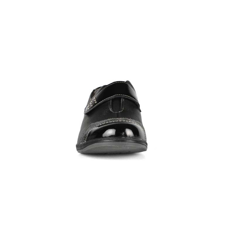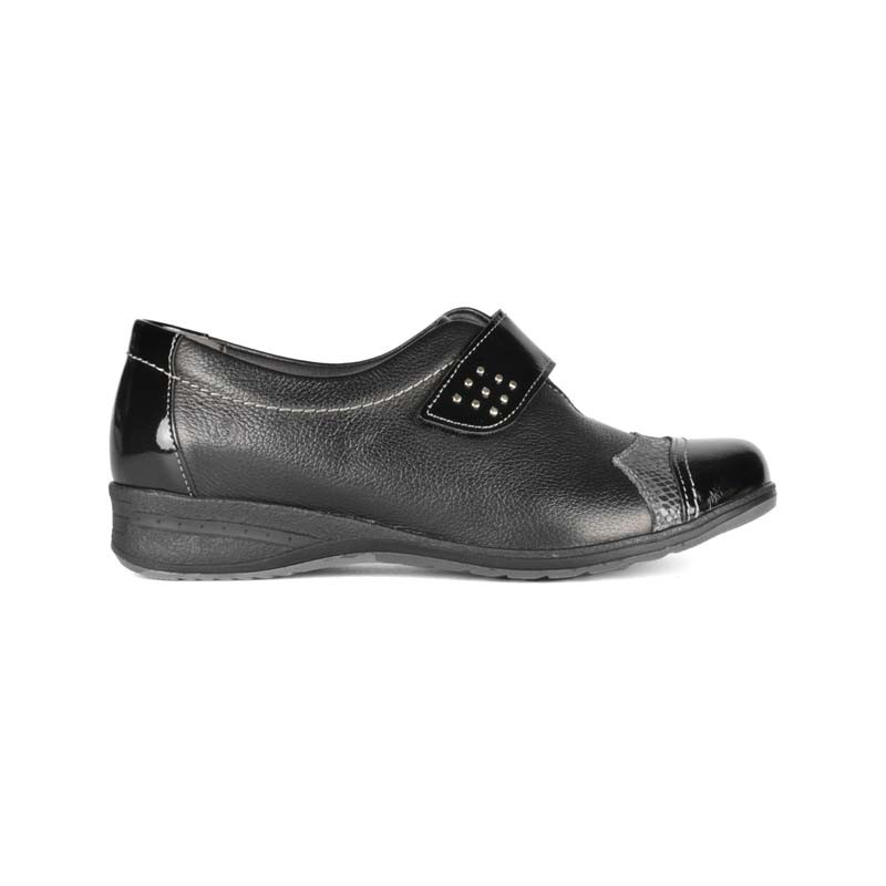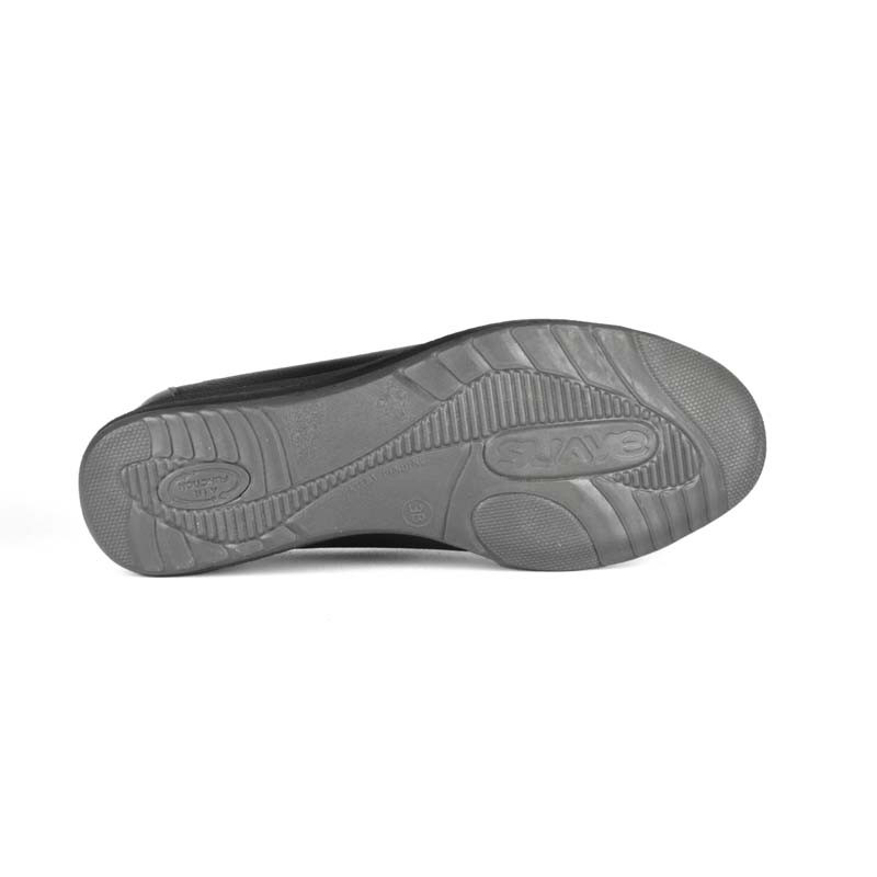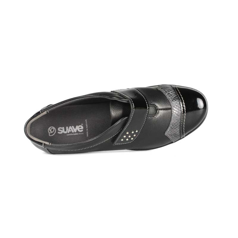 Chaussures de confort pour femme souples et très légères, munies d'un Velcro pour faciliter l'insertion du pied. Confectionnées en cuir, elles s'habillent de noir et sont réhaussées de strass et d'effets de matière pour combler vos envies de mode. Doublées en textile respirant, ces chaussures Suave pourront par ailleurs accueillir vos semelles orthopédiques. Un petit talon compensé de 3 cm et un bon amorti pour rendre la marche moins fatigante viennent parfaire ces chaussures de confort parfaites pour le quotidien.