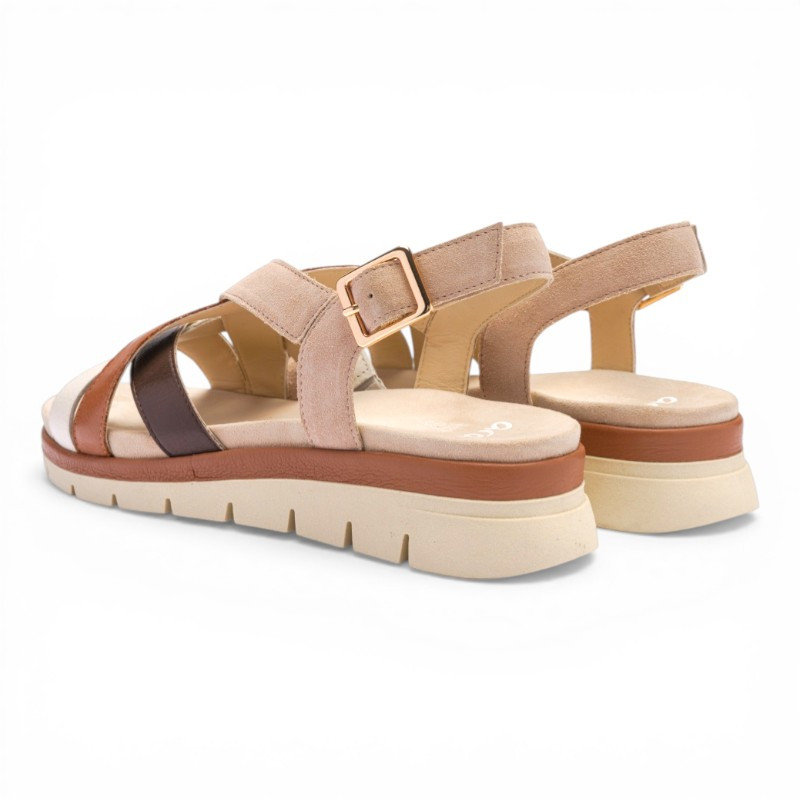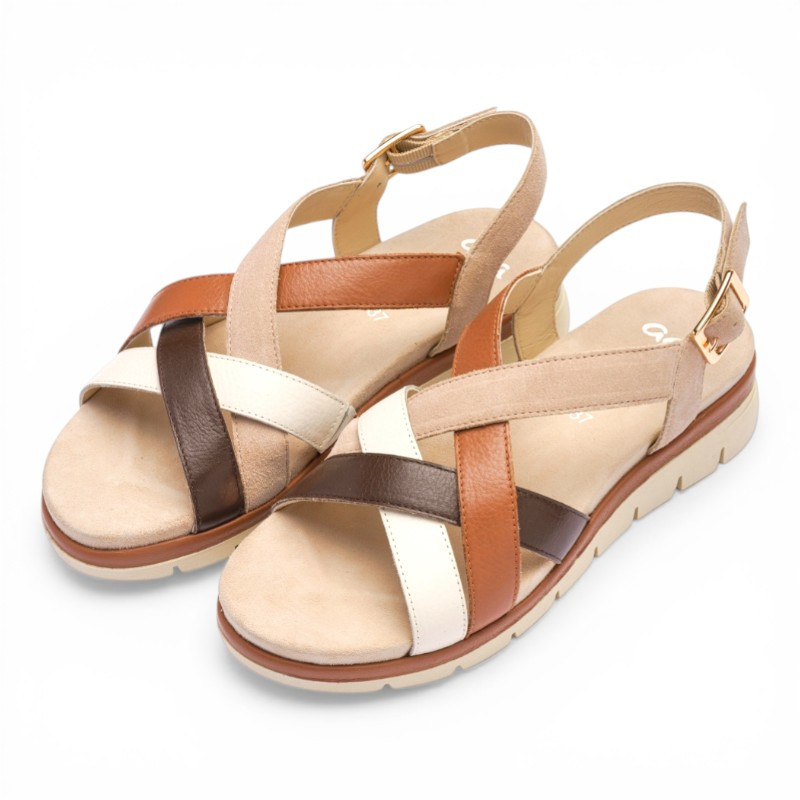 Elle se distingue par ses brides croisées en cuir aux teintes naturelles et chaleureuses qui apportent du relief et une touche élégante. La bride arrière est équipée d’une boucle réglable, permettant un ajustement précis au pied.